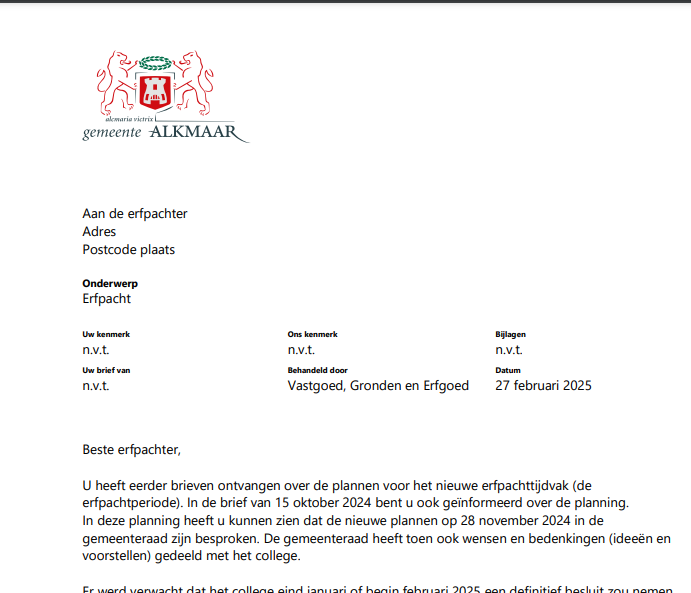 De erfpachteigenaren hebben vandaag een informatiebrief ontvangen van de gemeente Alkmaar over de besluitvorming van het nieuwe erfpachtbeleid, hieronder leest u de inhoud van deze brief;